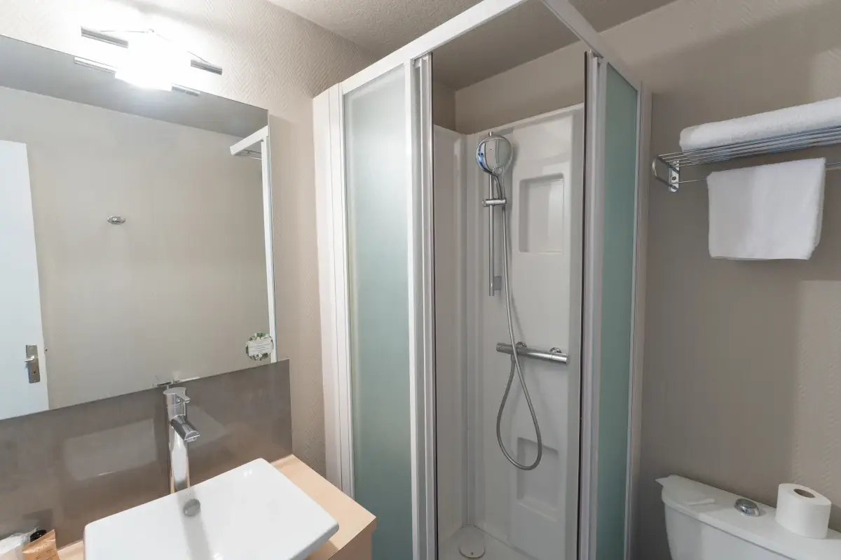• Bathroom with shower, sink, toilet, courtesy kit, and towels